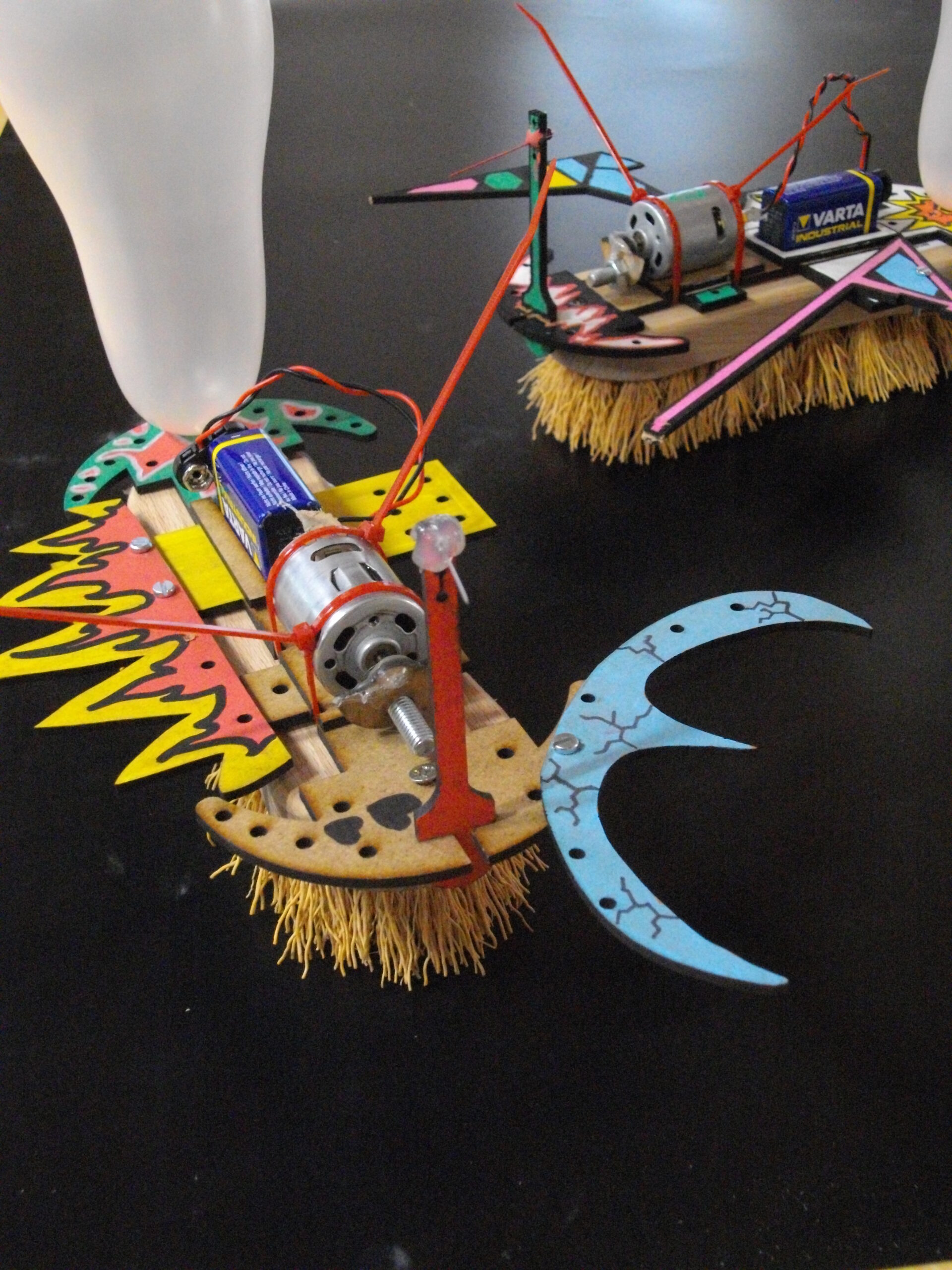 L’animateur fait la démonstration d’un robot qui se déplace de manière aléatoire. Il est composé d’une brosse ménagère sur laquelle ont été fixés différents éléments.
