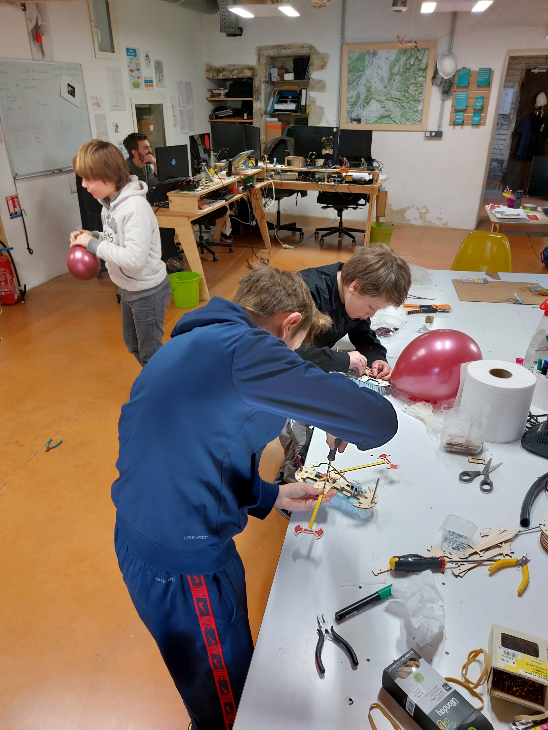 Les participants reçoivent un kit comprenant un moteur, une pile et différents composants qu’ils vont devoir assembler étape par étape en suivant les indications de l’animateur. Ils vont ensuite personnaliser leur robot en dessinant et en fixant d’autres éléments qui auront été découpés au laser.